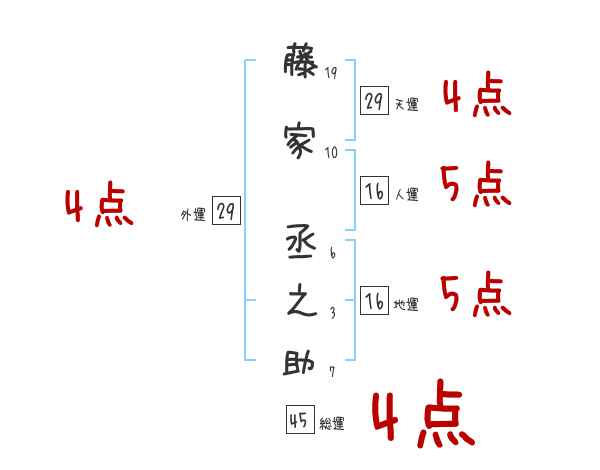 天運![]() | 藤家丞之助さんの天運は29画の4つ星!完全主義で才能がある。厳格な心の持ち主。 家系が持つ宿命的な運勢を表します。祖先から受け継いだ苗字ですので自分の力が及びません。家柄を象徴します。 |