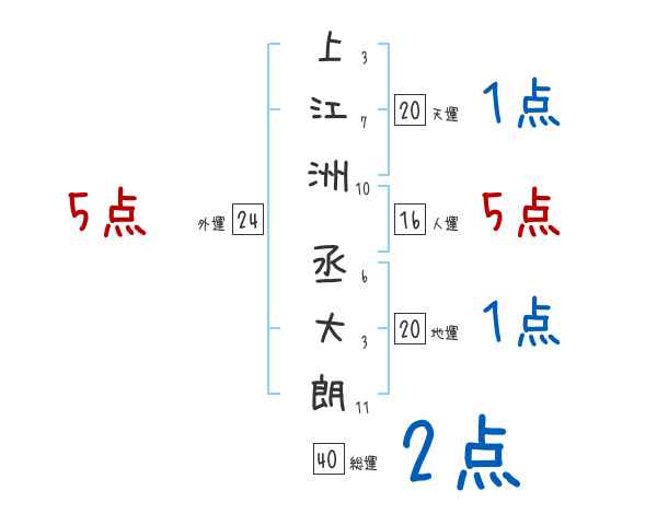 人運![]() | 上江洲丞大朗さんの人運は16画の5つ星!人望が厚く大きく発展する。逆転成功が見える。 性格や才能などを表す2番目に重要な運勢です。人間関係や協調性、社会的な成功に影響します。主に20歳から50歳ぐらいまでの中年期の運勢を表します。 |