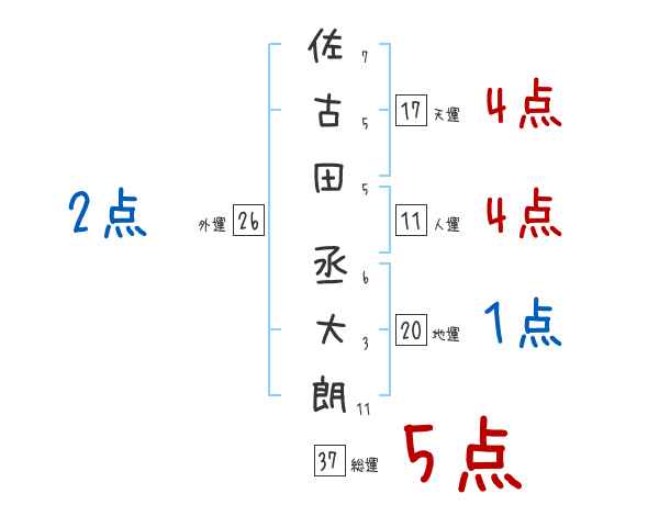 天運![]() | 佐古田丞大朗さんの天運は17画の4つ星!積極的な行動力。地位を気づき財産を手に入れる。純粋な心と直感力。 家系が持つ宿命的な運勢を表します。祖先から受け継いだ苗字ですので自分の力が及びません。家柄を象徴します。 |