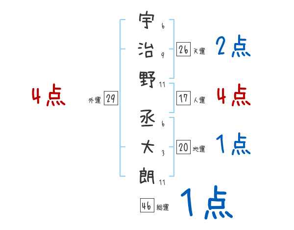 天運![]() | 宇治野丞大朗さんの天運は26画の2つ星!波瀾万丈かも。信頼できる人を大事にしましょう。 家系が持つ宿命的な運勢を表します。祖先から受け継いだ苗字ですので自分の力が及びません。家柄を象徴します。 |