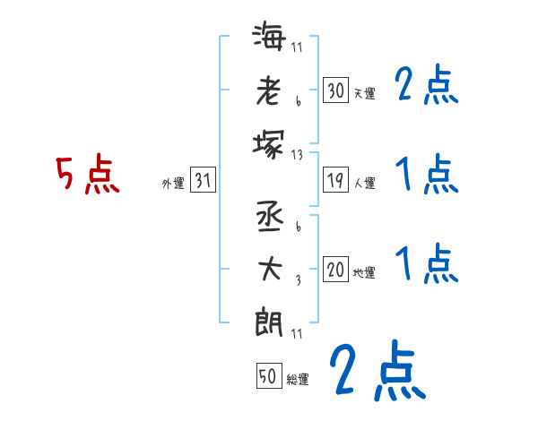 外運![]() | 海老塚丞大朗さんの外運は31画の5つ星!社交性があり判断力に優れる。順風満帆な人生で円満な生活。 生活面を象徴する運勢です。外部から受ける影響力を表し、結婚運、家庭運や職場、環境への順応性を表します。 |