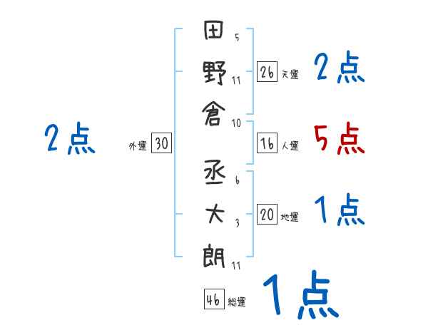 人運![]() | 田野倉丞大朗さんの人運は16画の5つ星!人望が厚く大きく発展する。逆転成功が見える。 性格や才能などを表す2番目に重要な運勢です。人間関係や協調性、社会的な成功に影響します。主に20歳から50歳ぐらいまでの中年期の運勢を表します。 |