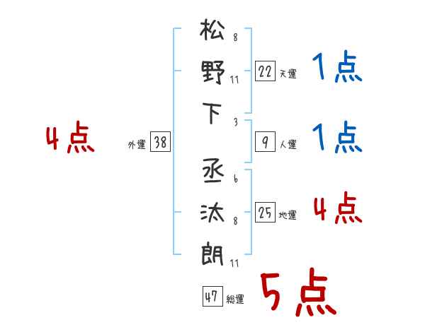 総運![]() | 松野下丞汰朗さんの総運は47画の5つ星!実力が開花し発展する円満な人生。財に恵まれる。 あなたの人生を表す1番重要な運勢です。生涯を通じて影響する総合運となり、主に50歳以降の晩年期に影響を及ぼします。 |