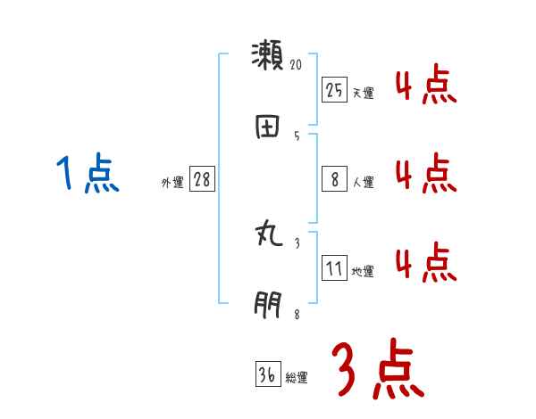 総運![]() | 瀬田丸朋さんの総運は36画の3つ星!先見性が豊かです。多少神経質で苦労することも。 あなたの人生を表す1番重要な運勢です。生涯を通じて影響する総合運となり、主に50歳以降の晩年期に影響を及ぼします。 |