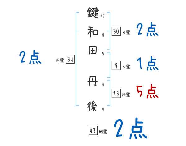 天運![]() | 鍵和田丹後さんの天運は30画の2つ星!浮き沈みの激しさに注意しましょう。 家系が持つ宿命的な運勢を表します。祖先から受け継いだ苗字ですので自分の力が及びません。家柄を象徴します。 |