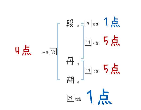 天運![]() | 段丹胡さんの天運は9画の1つ星!消極的で才能を発揮することが苦手なことも。周りの意見に耳を傾けましょう。 家系が持つ宿命的な運勢を表します。祖先から受け継いだ苗字ですので自分の力が及びません。家柄を象徴します。 |