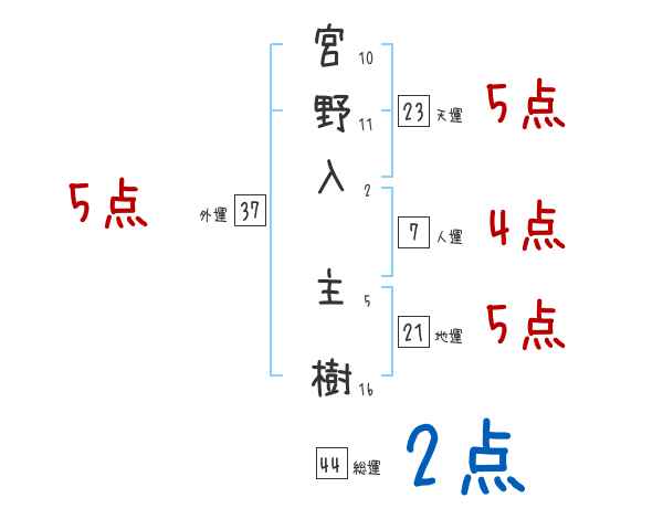 外運![]() | 宮野入主樹さんの外運は37画の5つ星!努力家で順応性に優れる。現実的な考え方ができ忠実に物事をこなす。 生活面を象徴する運勢です。外部から受ける影響力を表し、結婚運、家庭運や職場、環境への順応性を表します。 |