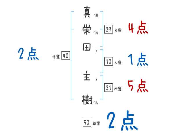 天運![]() | 真栄田主樹さんの天運は29画の4つ星!完全主義で才能がある。厳格な心の持ち主。 家系が持つ宿命的な運勢を表します。祖先から受け継いだ苗字ですので自分の力が及びません。家柄を象徴します。 |