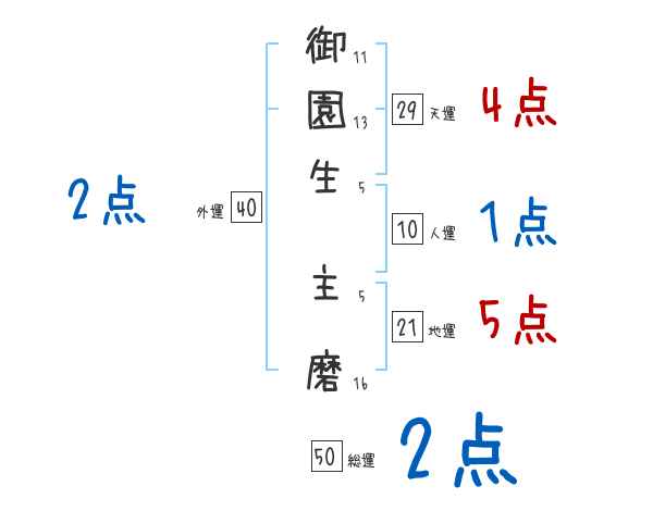 総運![]() | 御園生主磨さんの総運は50画の2つ星!浮き沈みが激しく不安定。しりすぼみに衰退しやすいので注意しましょう。 あなたの人生を表す1番重要な運勢です。生涯を通じて影響する総合運となり、主に50歳以降の晩年期に影響を及ぼします。 |