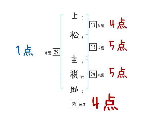 外運![]()  | 上松主税助さんの外運は22画の1つ星!努力することが苦手ないっぽう手先が器用。芸術性にも優れる。 生活面を象徴する運勢です。外部から受ける影響力を表し、結婚運、家庭運や職場、環境への順応性を表します。 |