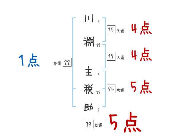 外運![]() | 川淵主税助さんの外運は22画の1つ星!努力することが苦手ないっぽう手先が器用。芸術性にも優れる。 生活面を象徴する運勢です。外部から受ける影響力を表し、結婚運、家庭運や職場、環境への順応性を表します。 |