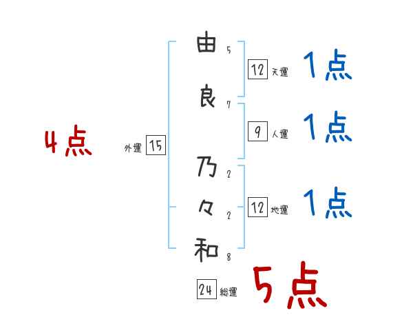 総運![]() | 由良乃々和さんの総運は24画の5つ星!家庭運が良く順調な人生。金運にも恵まれる。 あなたの人生を表す1番重要な運勢です。生涯を通じて影響する総合運となり、主に50歳以降の晩年期に影響を及ぼします。 |