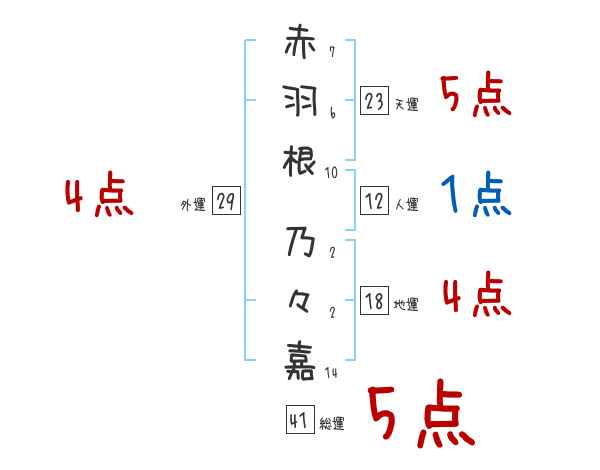 天運![]() | 赤羽根乃々嘉さんの天運は23画の5つ星!想像力に優れ活力がある。一代で成功し名誉を手に入れる。 家系が持つ宿命的な運勢を表します。祖先から受け継いだ苗字ですので自分の力が及びません。家柄を象徴します。 |
