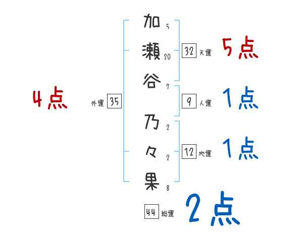 天運![]() | 加瀬谷乃々果さんの天運は32画の5つ星!柔軟性があり成功する。チャンスが多く金運が良い。 家系が持つ宿命的な運勢を表します。祖先から受け継いだ苗字ですので自分の力が及びません。家柄を象徴します。 |