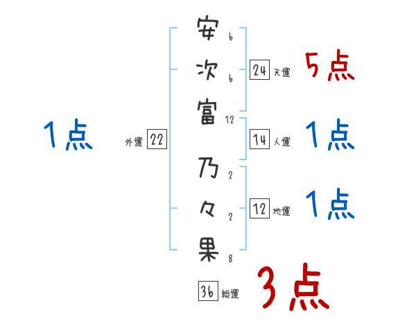総運![]() | 安次富乃々果さんの総運は36画の3つ星!先見性が豊かです。多少神経質で苦労することも。 あなたの人生を表す1番重要な運勢です。生涯を通じて影響する総合運となり、主に50歳以降の晩年期に影響を及ぼします。 |
