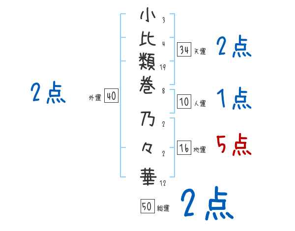 人運![]() | 小比類巻乃々華さんの人運は10画の1つ星!不安を感じやすい傾向。ストレスを抱えないように注意しましょう。 性格や才能などを表す2番目に重要な運勢です。人間関係や協調性、社会的な成功に影響します。主に20歳から50歳ぐらいまでの中年期の運勢を表します。 |