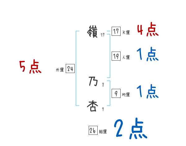 外運![]() | 嶺乃杏さんの外運は24画の5つ星!家庭運が良く順調な人生。金運にも恵まれる。 生活面を象徴する運勢です。外部から受ける影響力を表し、結婚運、家庭運や職場、環境への順応性を表します。 |
