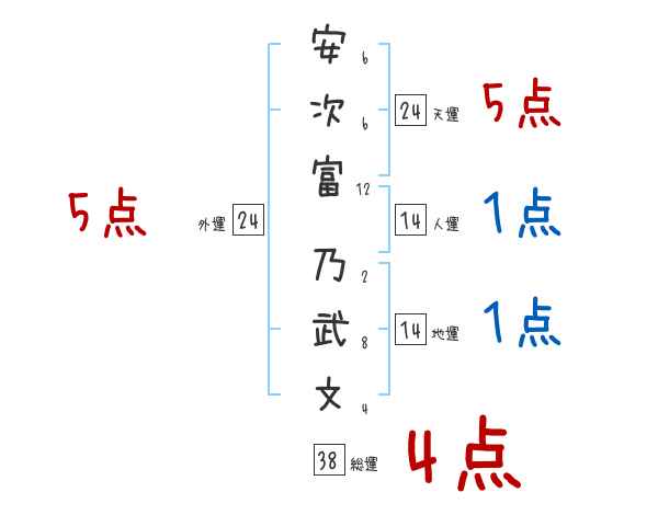 天運![]() | 安次富乃武文さんの天運は24画の5つ星!家庭運が良く順調な人生。金運にも恵まれる。 家系が持つ宿命的な運勢を表します。祖先から受け継いだ苗字ですので自分の力が及びません。家柄を象徴します。 |