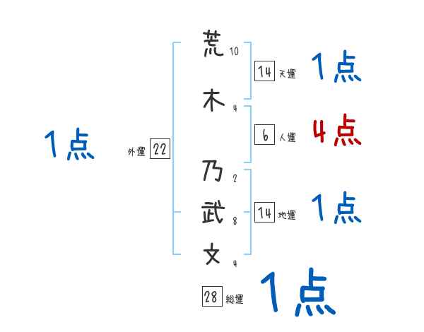 総運![]() | 荒木乃武文さんの総運は28画の1つ星!家庭環境に注意。スポーツで活躍できる能力があるかも。 あなたの人生を表す1番重要な運勢です。生涯を通じて影響する総合運となり、主に50歳以降の晩年期に影響を及ぼします。 |