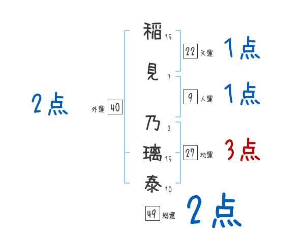 天運![]() | 稲見乃璃泰さんの天運は22画の1つ星!努力することが苦手ないっぽう手先が器用。芸術性にも優れる。 家系が持つ宿命的な運勢を表します。祖先から受け継いだ苗字ですので自分の力が及びません。家柄を象徴します。 |