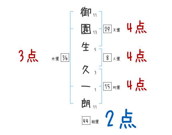総運![]() | 御園生久一朗さんの総運は44画の2つ星!誠実で慎重な性格。物事を考えすぎないように注意しましょう。 あなたの人生を表す1番重要な運勢です。生涯を通じて影響する総合運となり、主に50歳以降の晩年期に影響を及ぼします。 |
