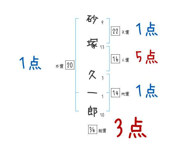 天運![]() | 砂塚久一郎さんの天運は22画の1つ星!努力することが苦手ないっぽう手先が器用。芸術性にも優れる。 家系が持つ宿命的な運勢を表します。祖先から受け継いだ苗字ですので自分の力が及びません。家柄を象徴します。 |