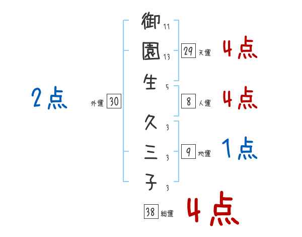 総運![]() | 御園生久三子さんの総運は38画の4つ星!温厚な性格で技術的な才能を発揮する。職人的な仕事に向いている。 あなたの人生を表す1番重要な運勢です。生涯を通じて影響する総合運となり、主に50歳以降の晩年期に影響を及ぼします。 |