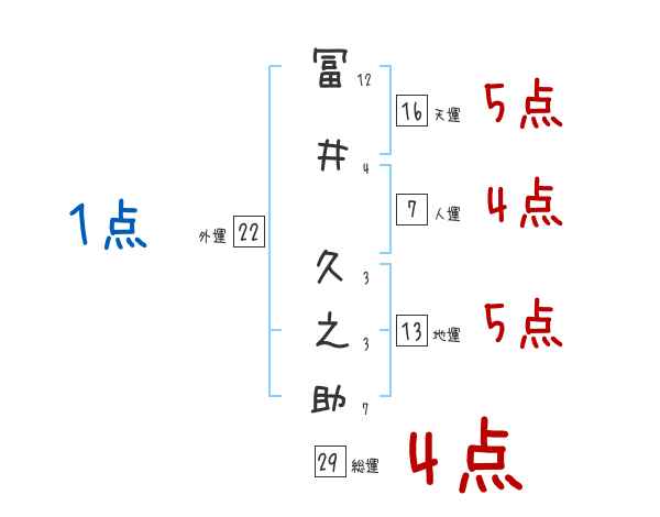 天運![]() | 冨井久之助さんの天運は16画の5つ星!人望が厚く大きく発展する。逆転成功が見える。 家系が持つ宿命的な運勢を表します。祖先から受け継いだ苗字ですので自分の力が及びません。家柄を象徴します。 |