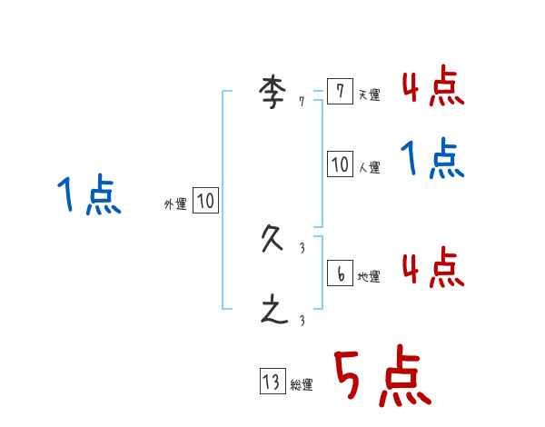 天運![]() | 李久之さんの天運は7画の4つ星!強い意志や信念を持ち独立心が強い。自立する。 家系が持つ宿命的な運勢を表します。祖先から受け継いだ苗字ですので自分の力が及びません。家柄を象徴します。 |
