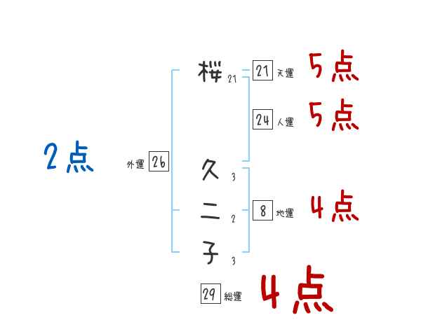 人運![]() | 桜久二子さんの人運は24画の5つ星!家庭運が良く順調な人生。金運にも恵まれる。 性格や才能などを表す2番目に重要な運勢です。人間関係や協調性、社会的な成功に影響します。主に20歳から50歳ぐらいまでの中年期の運勢を表します。 |