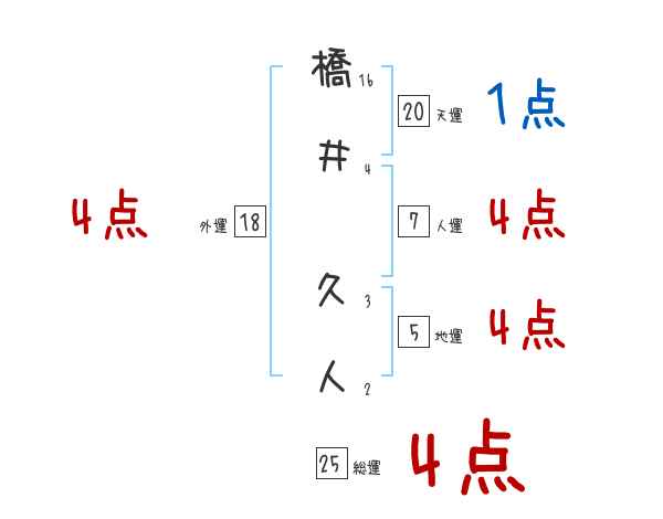 天運![]() | 橋井久人さんの天運は20画の1つ星!社交が苦手。人とは違った才能があり波乱万丈な人生かも。 家系が持つ宿命的な運勢を表します。祖先から受け継いだ苗字ですので自分の力が及びません。家柄を象徴します。 |