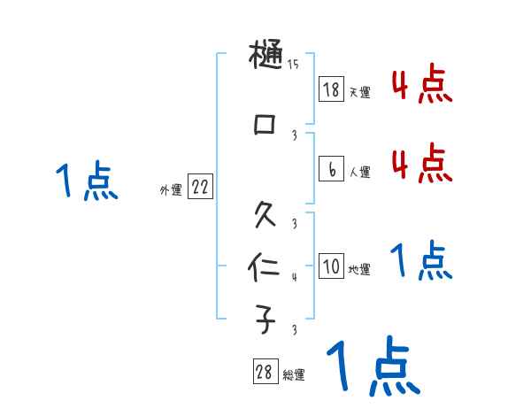 総運![]() | 樋口久仁子さんの総運は28画の1つ星!家庭環境に注意。スポーツで活躍できる能力があるかも。 あなたの人生を表す1番重要な運勢です。生涯を通じて影響する総合運となり、主に50歳以降の晩年期に影響を及ぼします。 |