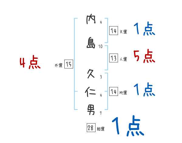 総運![]() | 内島久仁男さんの総運は28画の1つ星!家庭環境に注意。スポーツで活躍できる能力があるかも。 あなたの人生を表す1番重要な運勢です。生涯を通じて影響する総合運となり、主に50歳以降の晩年期に影響を及ぼします。 |