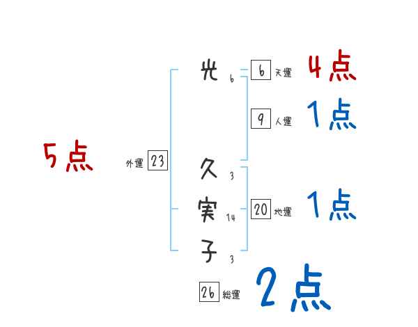 天運![]() | 光久実子さんの天運は6画の4つ星!慎重な努力家で信頼を得る。誠実な精神で向上心に優れる。 家系が持つ宿命的な運勢を表します。祖先から受け継いだ苗字ですので自分の力が及びません。家柄を象徴します。 |