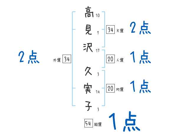 外運![]() | 高見沢久実子さんの外運は34画の2つ星!独創性に優れるが、自尊心が強く災難に注意しましょう。 生活面を象徴する運勢です。外部から受ける影響力を表し、結婚運、家庭運や職場、環境への順応性を表します。 |
