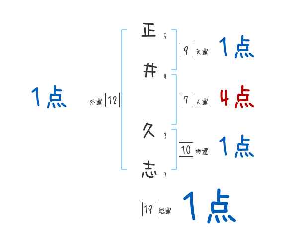 天運![]() | 正井久志さんの天運は9画の1つ星!消極的で才能を発揮することが苦手なことも。周りの意見に耳を傾けましょう。 家系が持つ宿命的な運勢を表します。祖先から受け継いだ苗字ですので自分の力が及びません。家柄を象徴します。 |