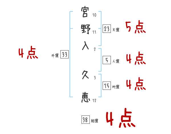 天運![]() | 宮野入久恵さんの天運は23画の5つ星!想像力に優れ活力がある。一代で成功し名誉を手に入れる。 家系が持つ宿命的な運勢を表します。祖先から受け継いだ苗字ですので自分の力が及びません。家柄を象徴します。 |