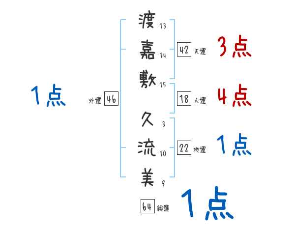 地運![]() | 渡嘉敷久流美さんの地運は22画の1つ星!努力することが苦手ないっぽう手先が器用。芸術性にも優れる。 個性を表す基礎的な運勢です。性格形成や対人関係、行動力など家庭環境に影響されます。主に誕生してから20歳くらいまでの若年期の運勢を表します。 |