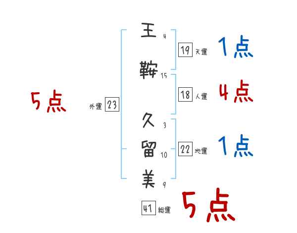 人運![]() | 王鞍久留美さんの人運は18画の4つ星!情熱的で剛気。忍耐力があり信頼される。 性格や才能などを表す2番目に重要な運勢です。人間関係や協調性、社会的な成功に影響します。主に20歳から50歳ぐらいまでの中年期の運勢を表します。 |