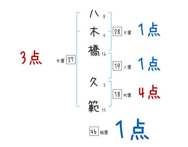 天運![]() | 八木橋久範さんの天運は28画の1つ星!家庭環境に注意。スポーツで活躍できる能力があるかも。 家系が持つ宿命的な運勢を表します。祖先から受け継いだ苗字ですので自分の力が及びません。家柄を象徴します。 |
