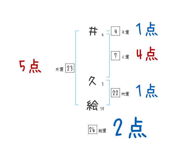 天運![]() | 井久絵さんの天運は4画の1つ星!感情が不安定で苦労するかも。周囲との協調を心掛けましょう。 家系が持つ宿命的な運勢を表します。祖先から受け継いだ苗字ですので自分の力が及びません。家柄を象徴します。 |