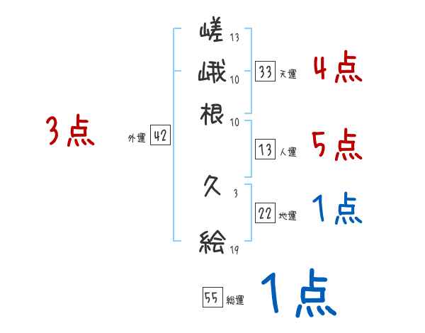 天運![]() | 嵯峨根久絵さんの天運は33画の4つ星!権力志向でプライドが高い。勇気があり運を切り開き成功する。 家系が持つ宿命的な運勢を表します。祖先から受け継いだ苗字ですので自分の力が及びません。家柄を象徴します。 |