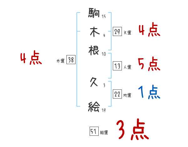 人運![]() | 駒木根久絵さんの人運は13画の5つ星!才能に恵まれ人気がある。名声を手に入れる。円満な人生。 性格や才能などを表す2番目に重要な運勢です。人間関係や協調性、社会的な成功に影響します。主に20歳から50歳ぐらいまでの中年期の運勢を表します。 |
