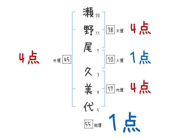 外運![]() | 瀬野尾久美代さんの外運は45画の4つ星!もくもくと物事を進め達成する。地味な努力家。 生活面を象徴する運勢です。外部から受ける影響力を表し、結婚運、家庭運や職場、環境への順応性を表します。 |