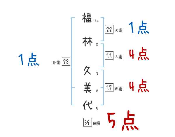 天運![]() | 福林久美代さんの天運は22画の1つ星!努力することが苦手ないっぽう手先が器用。芸術性にも優れる。 家系が持つ宿命的な運勢を表します。祖先から受け継いだ苗字ですので自分の力が及びません。家柄を象徴します。 |