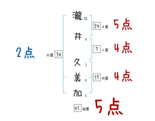 天運![]() | 瀧井久美加さんの天運は24画の5つ星!家庭運が良く順調な人生。金運にも恵まれる。 家系が持つ宿命的な運勢を表します。祖先から受け継いだ苗字ですので自分の力が及びません。家柄を象徴します。 |