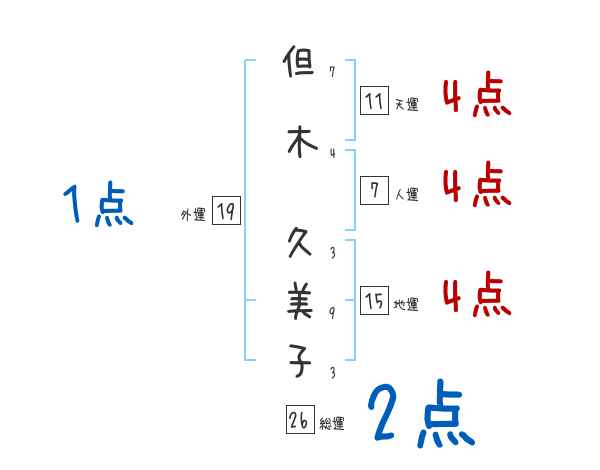 天運![]() | 但木久美子さんの天運は11画の4つ星!着実に富や地位を得る幸運な人生。 家系が持つ宿命的な運勢を表します。祖先から受け継いだ苗字ですので自分の力が及びません。家柄を象徴します。 |