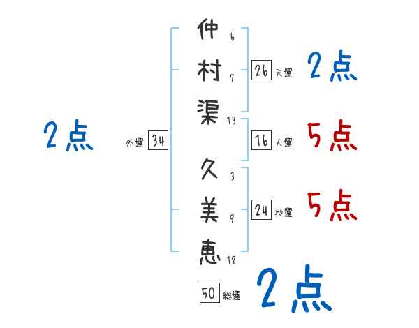 天運![]() | 仲村渠久美恵さんの天運は26画の2つ星!波瀾万丈かも。信頼できる人を大事にしましょう。 家系が持つ宿命的な運勢を表します。祖先から受け継いだ苗字ですので自分の力が及びません。家柄を象徴します。 |
