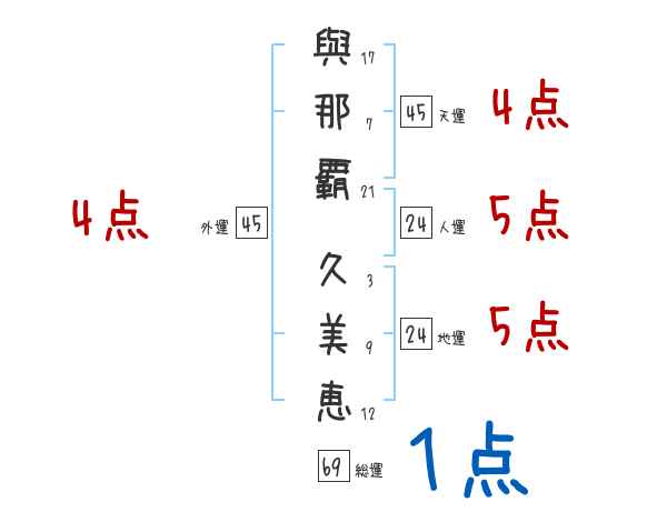 天運![]() | 與那覇久美恵さんの天運は45画の4つ星!もくもくと物事を進め達成する。地味な努力家。 家系が持つ宿命的な運勢を表します。祖先から受け継いだ苗字ですので自分の力が及びません。家柄を象徴します。 |