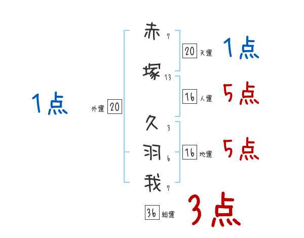 総運![]() | 赤塚久羽我さんの総運は36画の3つ星!先見性が豊かです。多少神経質で苦労することも。 あなたの人生を表す1番重要な運勢です。生涯を通じて影響する総合運となり、主に50歳以降の晩年期に影響を及ぼします。 |